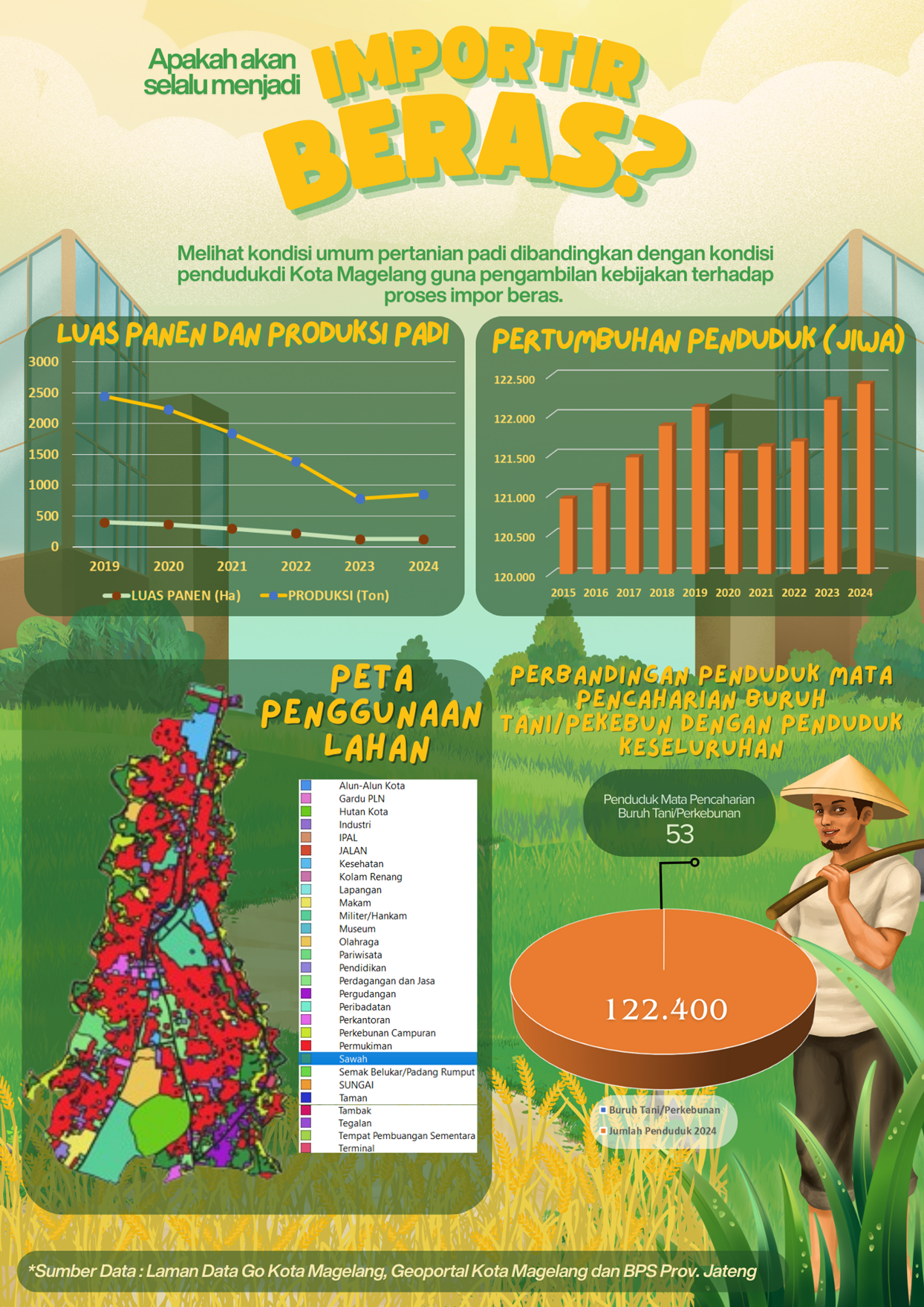 Walaupun disebut sebagai negara agraris, Indonesia masih melakukan impor beras dari negara lain. Hal ini dapat disebabkan karena menurunnya daya tanam dan produksi beras yang ada di Indonesia, khusunya pada daerah perkotaan. Kota Magelang merupakan salah satu daerah perkotaan yang berada di tengah-tengah Provinsi Jawa Tengah dengan berbagai keanekaragaman dan kondisi alam yang dapat mempengaruhi produksi beras. Lalu bagaimana kondisi produksi beras untuk mencukupi ketahanan pangan masyarakat di Kota Magelang?