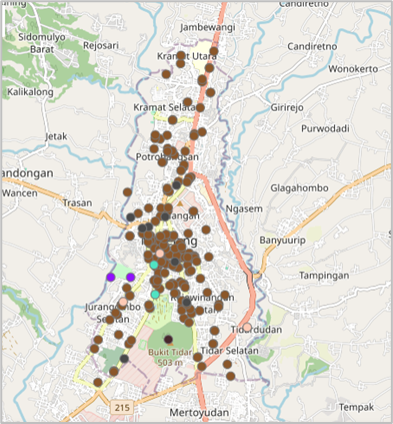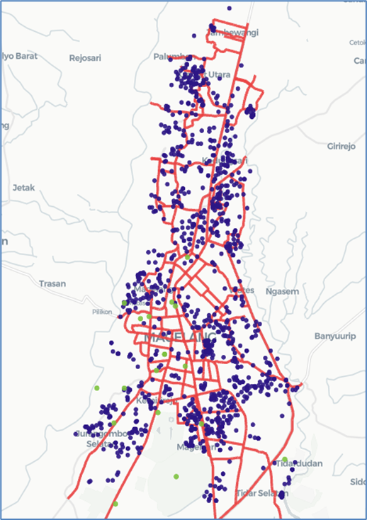 Peta integrasi data UMKM, destinasi wisata, dan jaringan jalan di Kota Magelang ini menunjukkan bagaimana angka-angka statistik dapat diubah menjadi gambaran nyata yang bercerita. Dari visualisasi terlihat bahwa UMKM terkonsentrasi di pusat kota, sementara destinasi wisata tersebar di titik-titik yang umumnya terhubung dengan jalur kolektor dan arteri. Pola ini menggambarkan potensi besar multiplier effect, dimana wisatawan yang berkunjung ke destinasi di sekitar pusat kota berpeluang langsung bersinggungan dengan sentra UMKM, sehingga mendorong pertumbuhan ekonomi lokal.