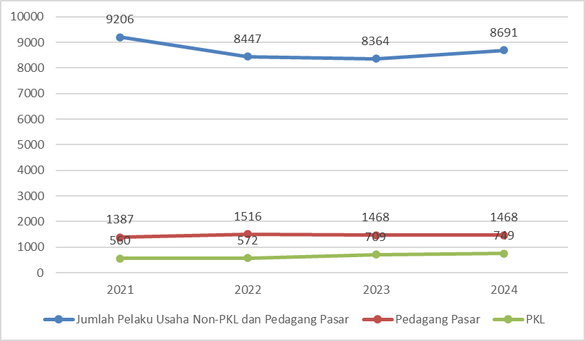 Berdasarkan grafik diatas dapat dilihat bahwa terdapat penurunan pada Jumlah Pelaku Usaha Non-PKL dan Pedagang Pasar dari tahun ke tahun disebabkan adanya persaingan yang ketat dan perubahan pola konsumsi masyarakat. Jumlah Pedagang Pasar dan Kaki Lima mengalami fluktuasi dari tahun ke tahun, hal ini menggambarkan dinamika usaha informal yang sangat adaptif terhadap kondisi yang ada di lapangan. Ketika jumlah permintaan tinggi maka jumlah pedagang akan bertambah, tetapi Ketika tekanan ekonomi meningkat maka Sebagian pedagang akan memilih untuk berhenti atau berpindah usaha. Meskipun potensi UMKM dan pariwisata di Kota Magelang cukup menjanjikan, namun data yang tersedia masih tersebar di berbagai sumber dan belum terintegrasi. Contohnya data persebaran volume kendaraan terhadap kapasitas jalan, persebaran umkm dan pariwisata.