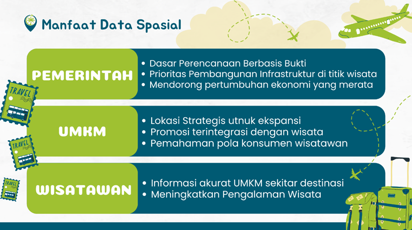 Peta spasial adalah representasi visual yang menampilkan berbagai lapisan data pada satu bidang peta, sehingga hubungan antar sektor dapat terlihat secara jelas, dengan pendekatan tersebut maka Pemerintah dapat lebih mudah merumuskan kebijakan yang lebih terukur, karena setiap keputusan berbasis pada keterhubungan yang realistis antara transportasi, pariwisata dan ekonomi kreatif. Pada RPJMD sudah menekankan data spasial dan penguatan sektor UMKM, wisata, serta transportasi. Namun, belum terlihat adanya integrasi spasial lintas sektor. Padahal, dengan integrasi ini, sehingga dapat meningkatkan efek berganda pembangunan (multiplier effect) bisa tercapai. Pengintegrasian data dengan menggabungkan data persebaran arus kendaraan, umkm dan destinasi wisata kemudian diolah menjadi satu data digital yang dapat digunakan sebagai data yang konkret dan dapat menjadi bahan perumusan kebijakan. Berikut dapat dilihat data yang telah diintegrasikan menjadi 1.