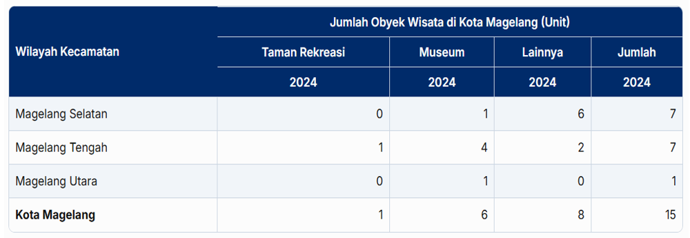 Berdasarkan data dari Badan Pusat Statistik ( BPS ), berikut bisa kita lihat perkembangan jumlah objek wisata di Kota Magelang selama Tahun 2024.