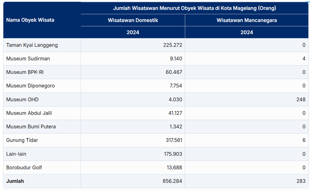 Dari tabel diatas, terlihat bahwa tingkat kunjungan wisatawan domestik dan mancanegara tahun 2024 apabila dikomparasikan, masih didominasi oleh wisatawan domestik, dimana selama tahun 2024 jumlah kunjungan wisatawan domestik sebesar 856.284 orang dan mancanegara sejumlah 283 orang. Untuk objek wisata dengan jumlah kunjungan terbesar masih dominasi oleh Gunung Tidar, Taman Kyai Langgeng, dan Museum BPK.