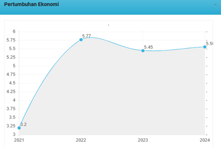 Grafik di atas menunjukkan bahwa pertumbuhan ekonomi Kota Magelang dengan angka pertumbuhan sebesar 3,20 % pada tahun 2021 yang menunjukkan adanya pemulihan awal setelah kemungkinan perlambatan ekonomi akibat dari pandemi Covid-19. Kemudian ada sedikit penurunan sebesar 5,45 % pada tahun 2023 yang melambat jika dibandingkan tahun sebelumnya, tapi angkanya masih relatif tinggi dan menandakan bahwa ekonomi tetap tumbuh stabil. Terdapat sedikit kenaikan pada tahun 2024 menjadi 5,56 % yang menunjukkan bahwa setelah penurunan pada tahun 2023, perekonomian Kota Magelang mengalami kenaikan meskipun tidak setinggi tahun 2022. Grafik di atas dapat menjadi tanda bahwa adanya peluang bagus untuk mengembangkan bisnis, menarik investasi baru, dan meningkatkan penghasilan masyarakat, dan mendukung pembangunan kota di masa depan berdasarkan pertumbuhan ekonomi Kota Magelang yang stabil setelah masa pemulihan.