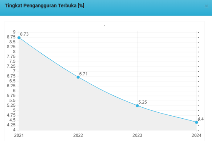 Dari dua grafik diatas menunjukkan bahwa ekonomi Kota Magelang terus tumbuh dari tahun 2021 hingga 2024 yang mencerminkan bahwa kebijakan pembangunan dan aktivitas ekonomi lokal berhasil menjaga stabilitas pertumbuhan. Berdasarkan data dari Badan Pusat Statistik Kota Magelang yang dilihat dari segi sektor usaha, Industri Pengolahan menjadi sektor yang paling dominan dalam struktur ekonomi Kota Magelang pada tahun 2024 dengan memberikan kontribusi sebesar 16,49%. Sementara itu, jika dilihat dari sisi pengeluaran, konsumsi rumah tangga menjadi komponen terbesar dalam struktur ekonomi Kota Magelang pada tahun 2024 dengan kontribusi mencapai 56,15%. Tingkat Pengangguran Terbuka (TPT) Kota Magelang menunjukkan penurunan dari 8,73% pada tahun 2021 menjadi 4,40% pada tahun 2024, seperti yang ditunjukkan pada Gambar 1.4. data dari platform DataGo Kota Magelang.