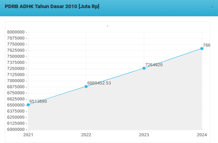 Perekonomian Kota Magelang berdasarkan Produk Domestik Regional Bruto (PDRB) Atas Dasar Harga Berlaku (ADHB) dengan tahun dasar 2010 mencapai sekitar Rp 11,82 miliar pada tahun 2024 yang menunjukkan adanya peningkatan stabil dan konsisten sejak tahun 2021, seperti yang diperlihatkan pada Gambar 1.2. data dari Badan Pusat Statistik (BPS) Kota Magelang. Sementara jika dihitung Atas Dasar Harga Konstan (ADHK) dengan tahun dasar 2010, angka tersebut mencapai sebesar Rp 7,66 miliar pada tahun 2024, seperti yang diperlihatkan pada Gambar 1.3. data dari platform DataGo Kota Magelang.